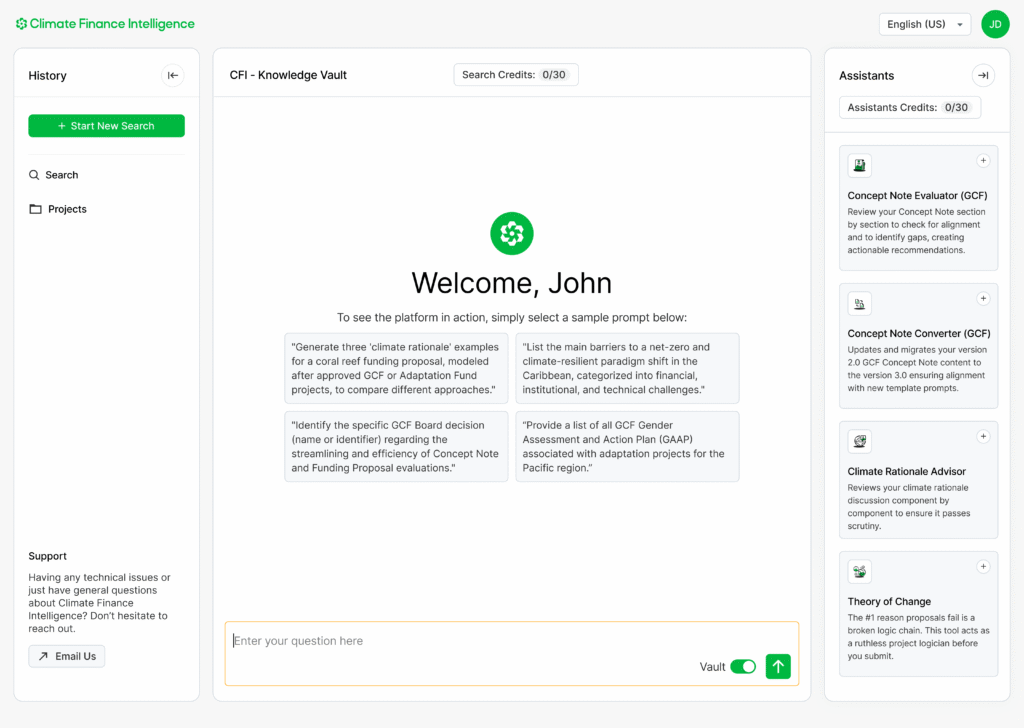 Our platform is built for the climate finance sector, giving you access to our 'Knowledge Vault' of approved projects to apply precedent-based project development, and specialized Assistants designed to copilot complex workflows like Concept Note Evaluations and Funding Proposals.