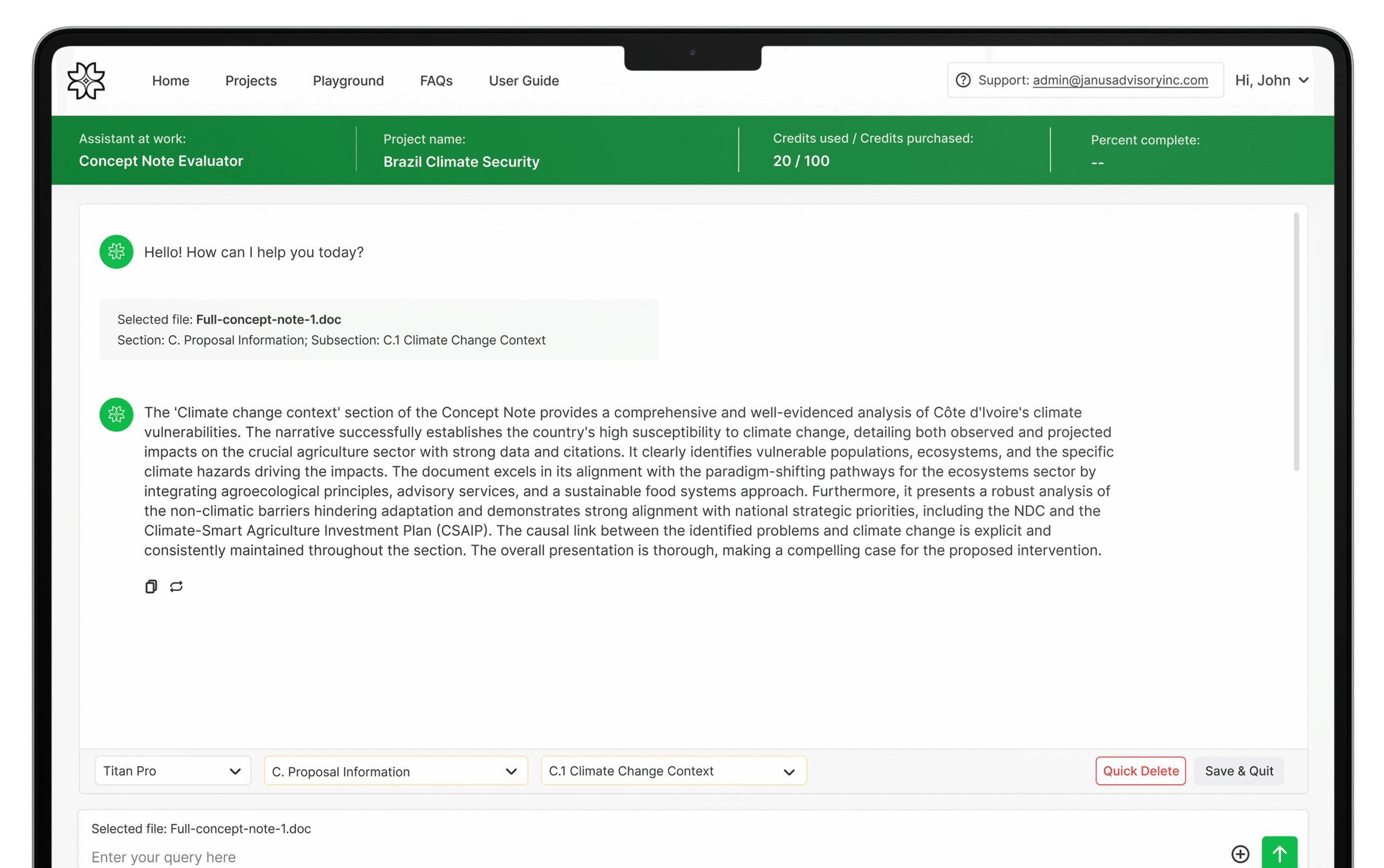 Submit every proposal with confidence. The Full Proposal Evaluator automatically checks your document against the latest GCF standards, leveraging its precision to ensure full compliance and significantly reduce the risk of rejection. With so much at stake, this Assistant is the key to positioning your proposal for success.